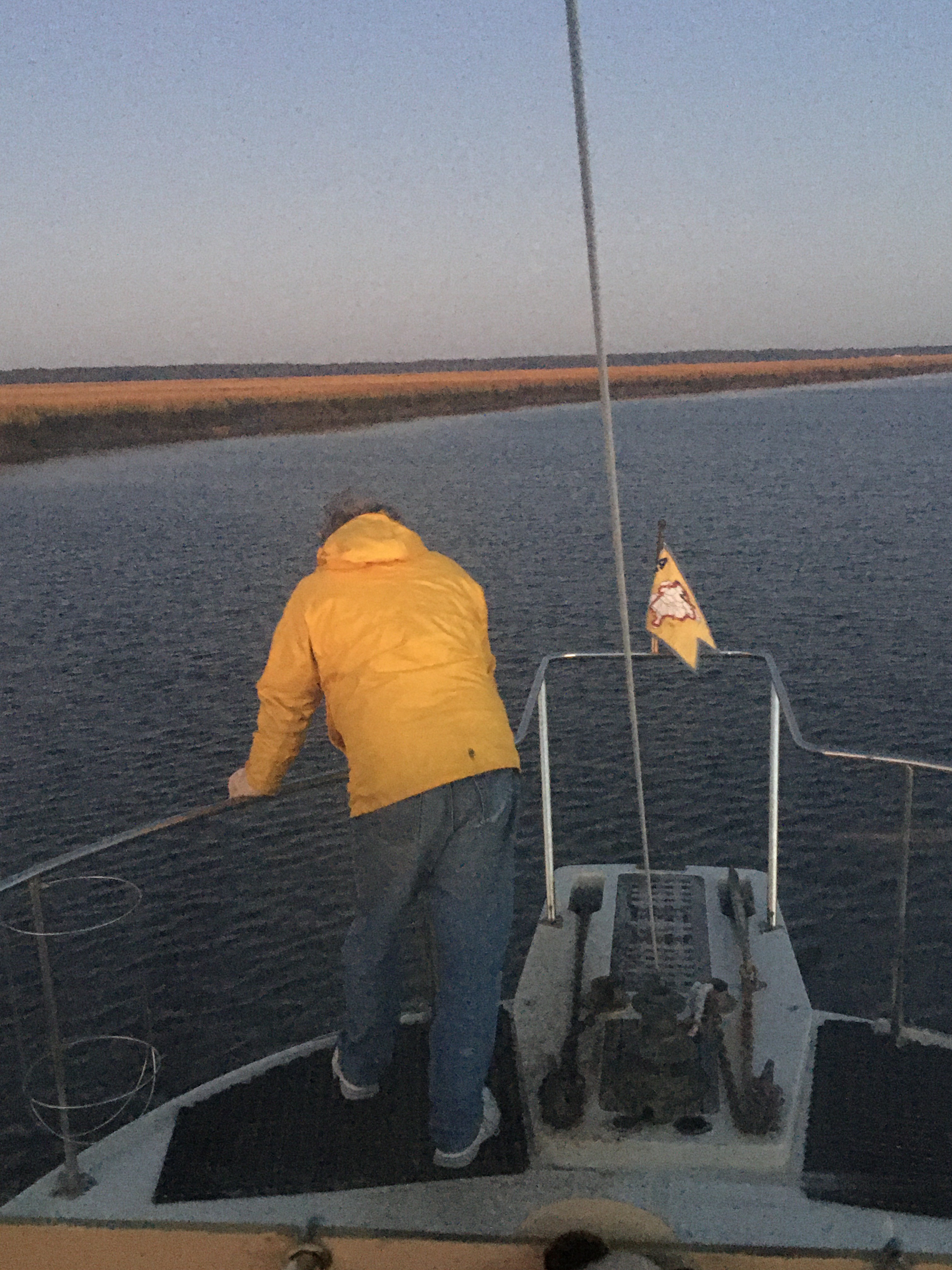 Monday, anchor up at 0700. I was late. We had an awesome night last night. Stars shining with very minimal light pollution. Nice breeze blowing down hatch over the bed. This is what a night at anchor should be. But, back to reality……crossing Abelmerle Sound. This is a wide, shallow body of water. A nasty chop builds easily. One of my least favorite parts of the ICW. SSW 10+ Washing machine action for about 4 hours. Arrived at Coinjock Marina (mm 49.6) around 11:45. Body felt rattled. We were lucky to get across, as the wind was building. Dinner at the Coinjock Restaurant, at the marina. It was packed for a Monday night. Great ribeye. Larry had shrimp, grits, with sausage. He said it was very good. We earned that dinner with that crossing this morning.