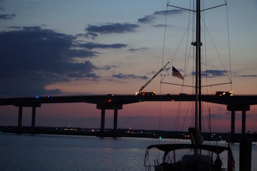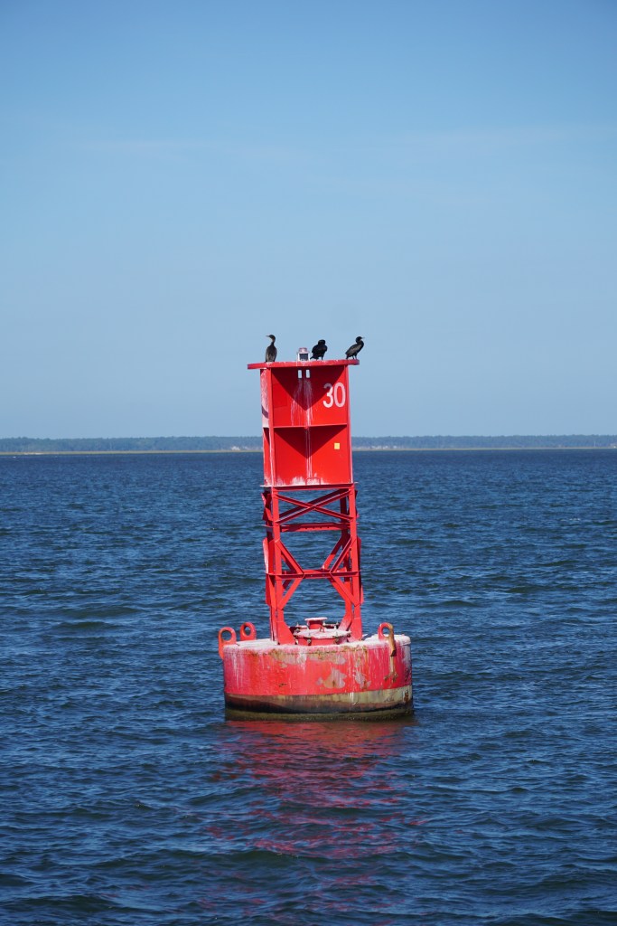 Wednesday, departed AYB at 8:45 for 9:00 bridge and then the lock. All smooth. After the bridge, a flock of pigeons flew by, then two white doves in front of us. We stopped at Top Rack Marin for fuel. Then the “industrial” ride, through the many shipyards and terminals of Norfolk. Still, interesting shapes, colors. I always get some good shots. Abtracts in the making. Arrived at Hampton Docks by 2:30. Young lady dockhand almost got knocked out by Panda Bear.I had to yell out. Went for a walk and lunch at Brown Cow/Brown Chicken. Later, with the wifi, we settled in to watch TV…. A sci-fi movie then the series, The Vikings. BTW, we crossed ICW mile 0 today. A mental milestone for me.